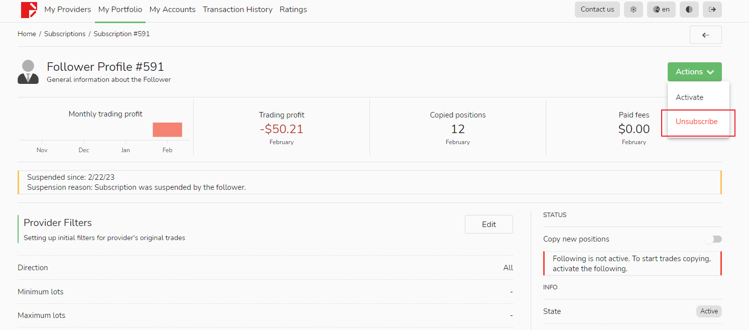 If followers want to stop following, they need to click the red [Unsubscribe] button.
