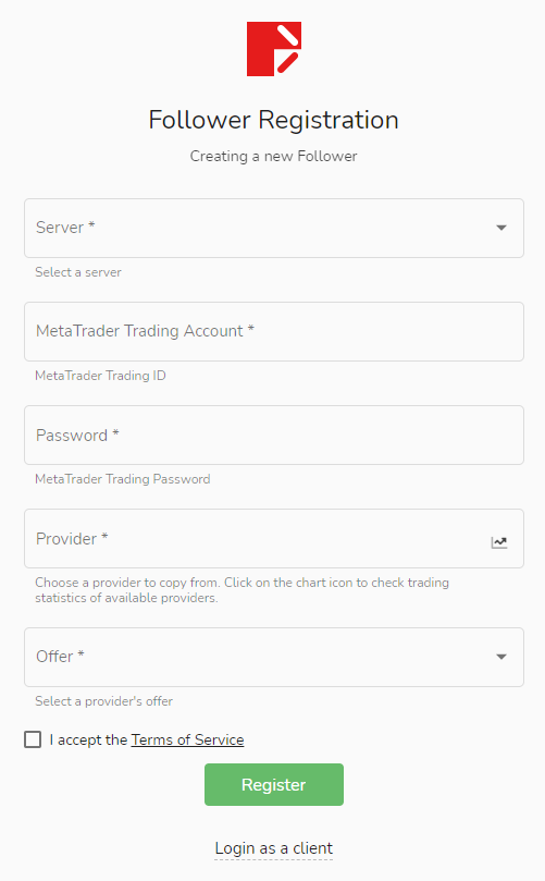 After successfully registering a follower, click [Add Follower] at the top right of the main page, then fill in [Trading Account], [Signal Source] and [Copy Conditions] in turn, and check [I accept the terms of service].