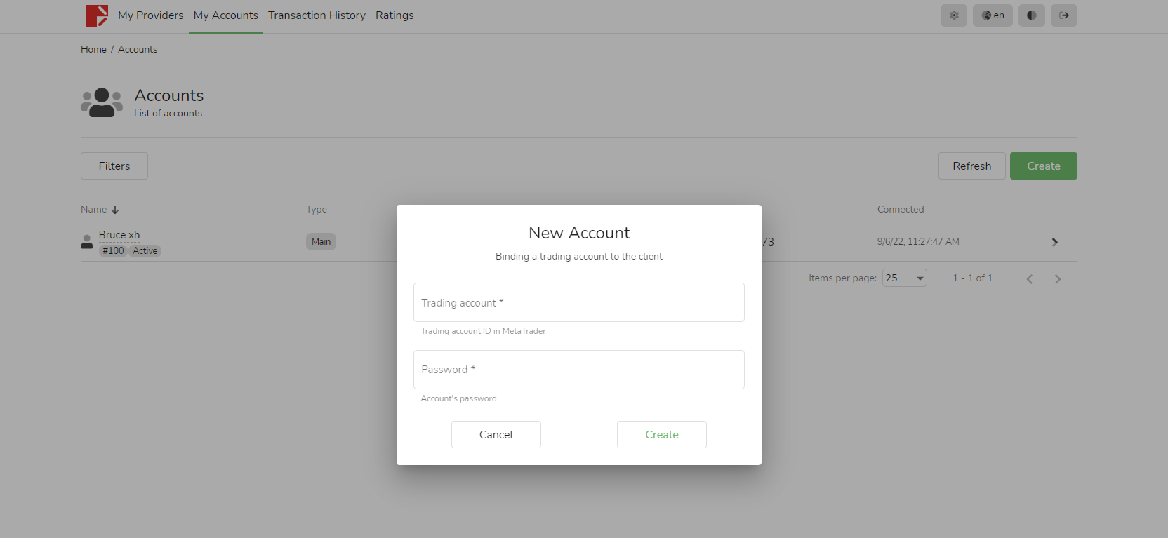 1. Puede iniciar sesión en CopyTrading, en la columna "Mi cuenta", haga clic en el botón verde "Crear" a la derecha.