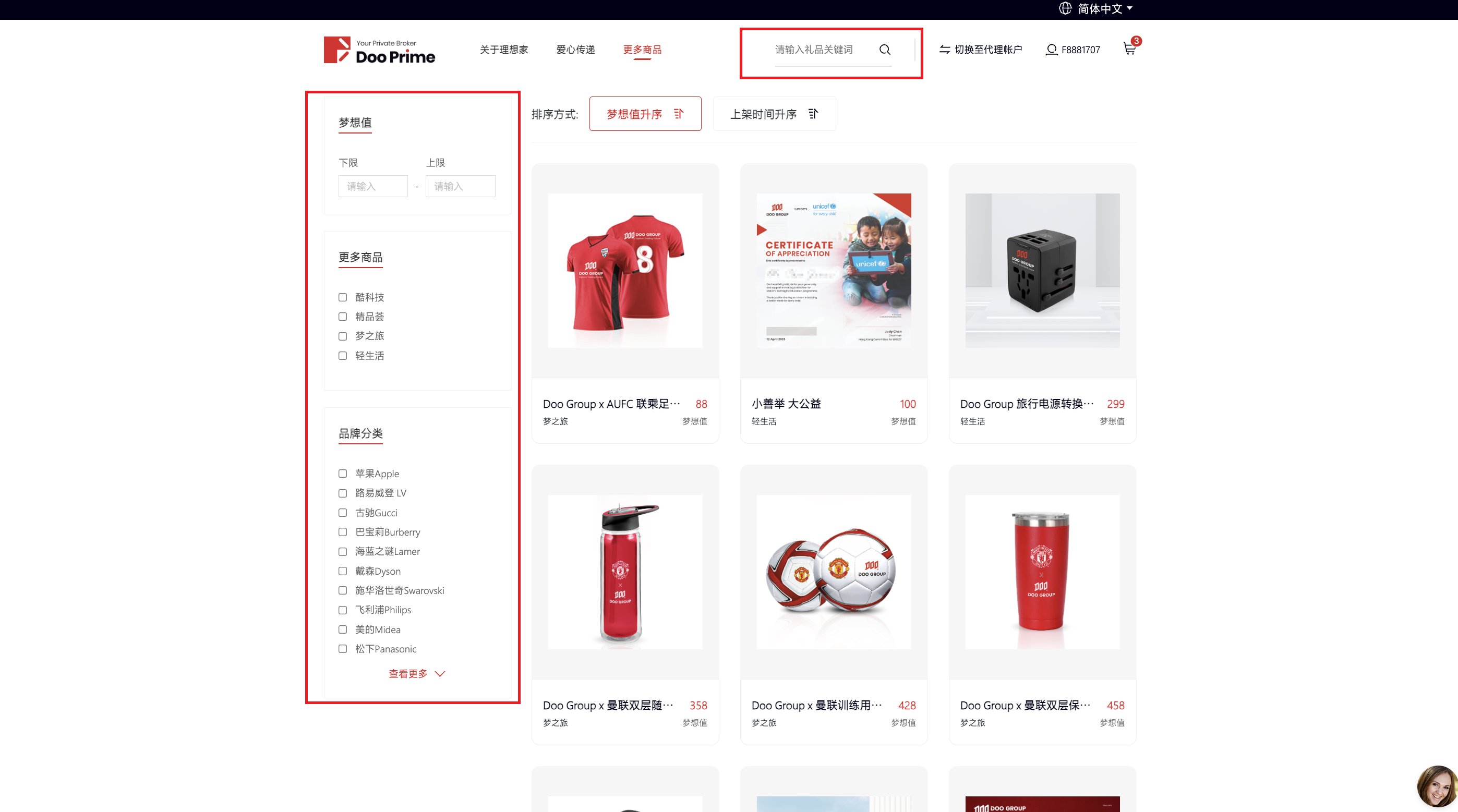 - Inicie sesión en el centro comercial de puntos Doo Prime "Ideal Home" y busque los regalos que desea por nombre/valor de sueño/categoría/marca