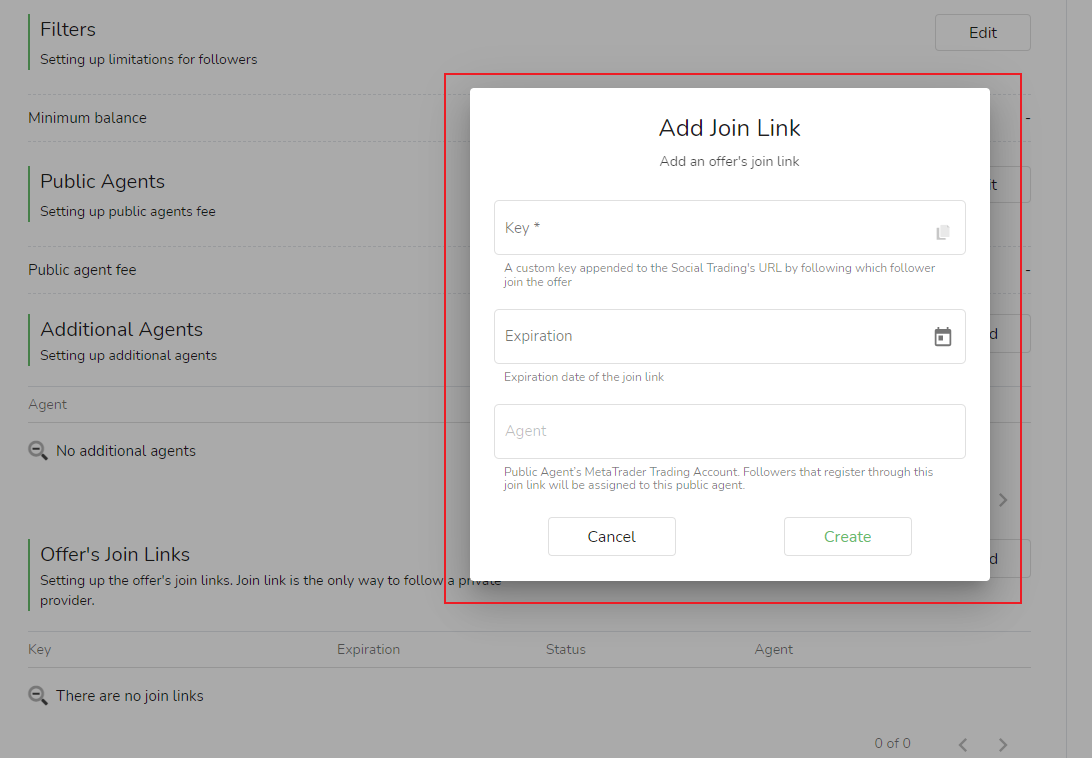 Una vez que el enlace de unión se haya creado con éxito, se mostrará en la posición anterior. Este enlace de unión tendrá los parámetros de la cuenta comercial de MetaTrader del presentador, por lo que los seguidores registrados a través del enlace de unión serán asignados directamente al presentador correspondiente.