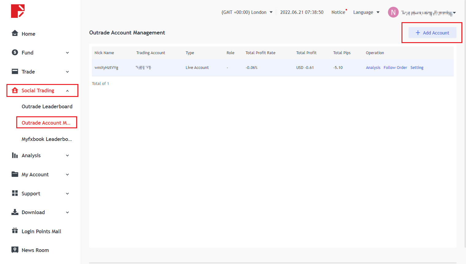 Inicie sesión en su Centro de usuarios de Doo Prime, haga clic en "Community Trading" en el lado izquierdo de la página de inicio, haga clic en "Outrade Account Management", haga clic en Add Account en el lado derecho de la página, seleccione el rol "Trader" o "Follower" , y finalmente vincular la cuenta que es Can.