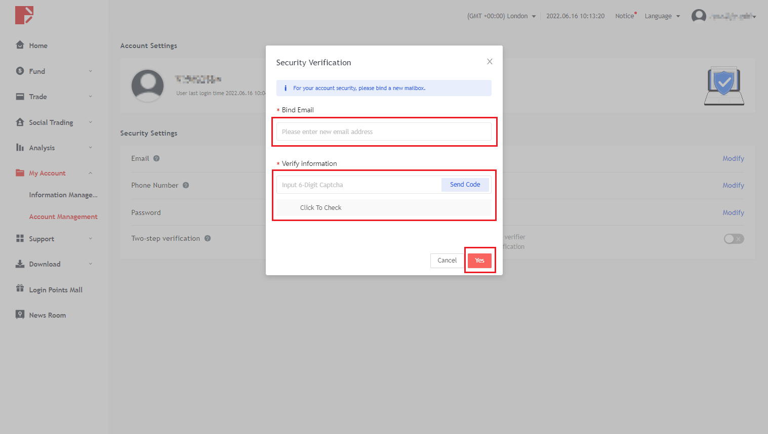 1. D Prime 사용자 센터에 로그인한 후, 왼쪽 열의 "내 계정"을 클릭하고, "계정 관리"를 선택하여 "계정 설정" 인터페이스에 들어간 후, "이메일" 또는 "휴대폰 번호"에서 "편집"을 클릭하세요.