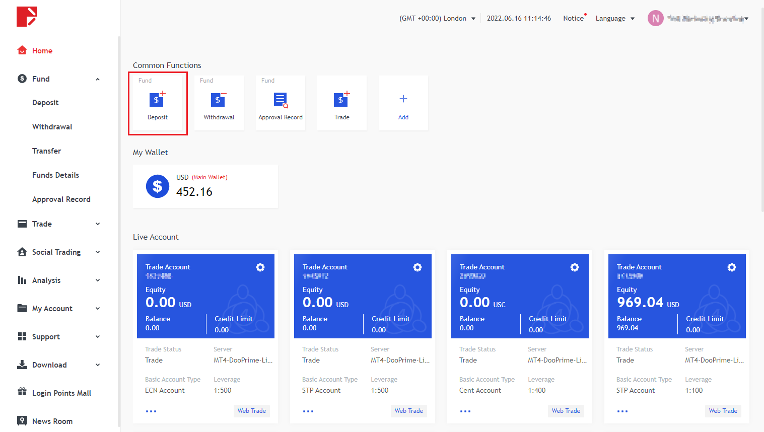 두프라임 유저센터 홈페이지 로그인 후 '공통기능' 항목의 '입금'을 클릭합니다.