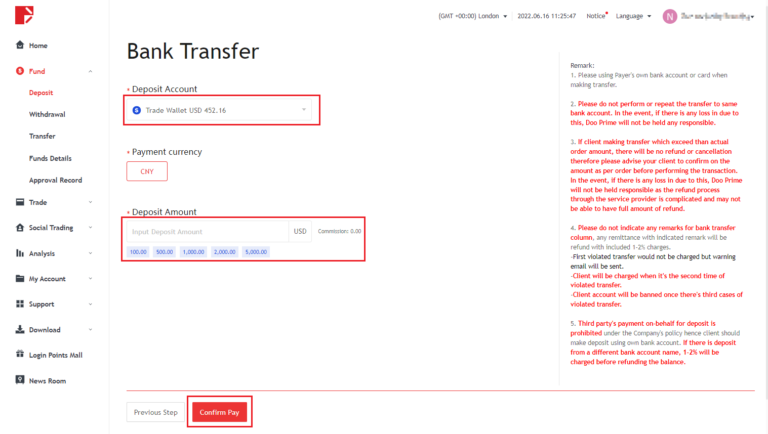 해당 입금 채널의 인터페이스로 이동하여 지침에 따라 입금합니다.