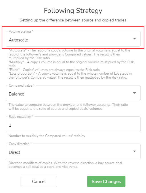 비교값:시그널 소스의 비율과 추종자 계정의 거래량, [Balance] 또는 [Equity]를 선택할 수 있습니다.
