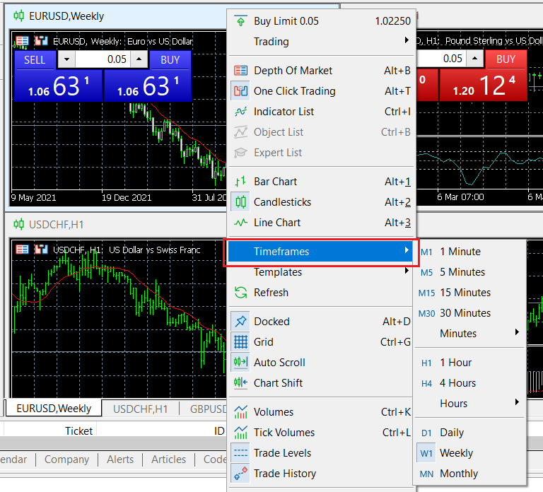 MT5의 메뉴바에서 [차트]를 우클릭하고 [주기]를 선택하면 MT5에서 선택할 수 있는 모든 시간대를 볼 수 있습니다.