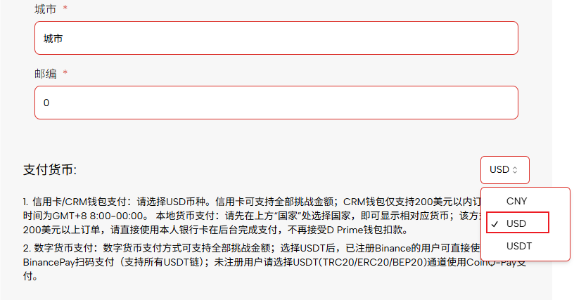• Na página de pagamento "nação" Selecione o país e o estado da moeda em que deseja pagar e Moeda de pagamento Selecione a moeda correspondente no menu suspenso (por exemploCNY).