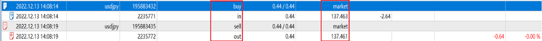 A abertura e o fechamento de uma ordem são exibidos separadamente de acordo com entrada e saída, entrada significa abertura de posição, saída significa fechamento de posição e somente a ordem de fechamento externa exibirá o valor de lucros e perdas;