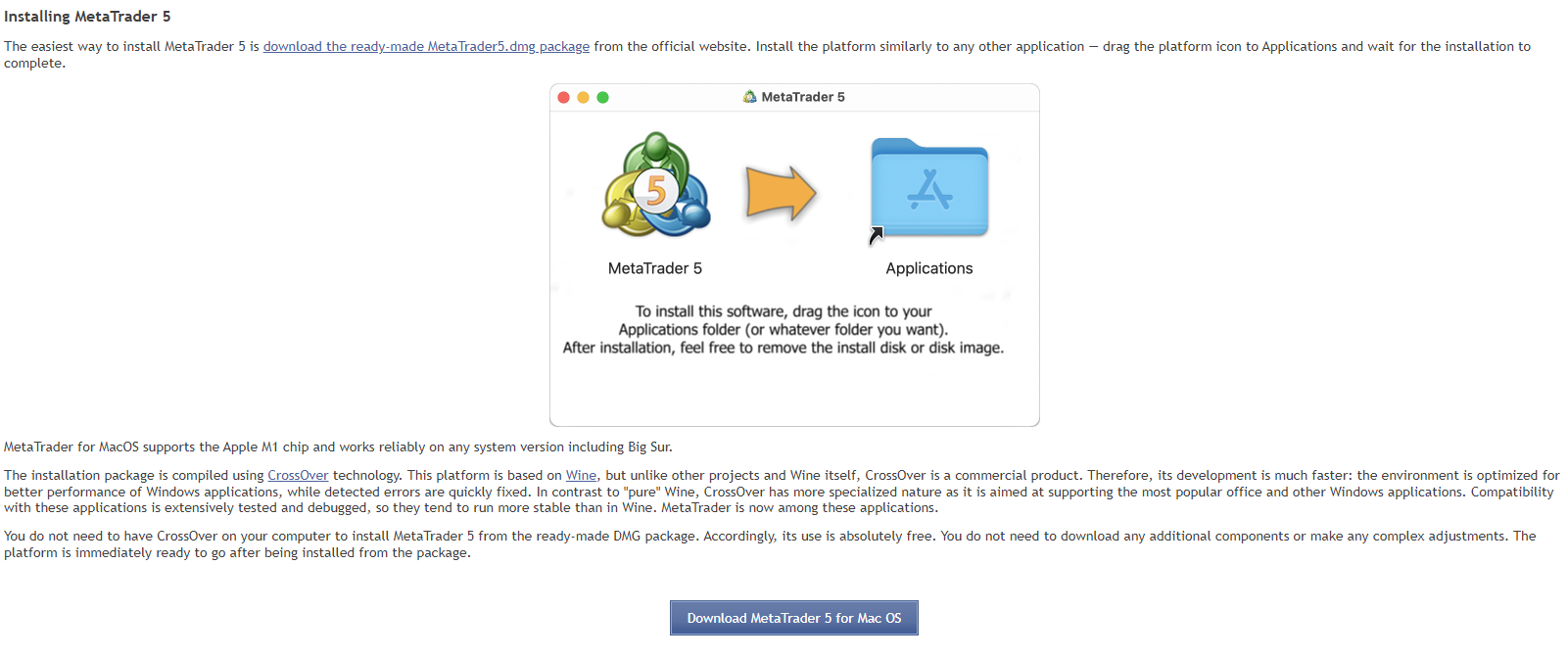 Depois de selecionar [macOS] para fazer o download, ele irá para a página seguinte, clique em [Download MetaTrader 5 for macOS]