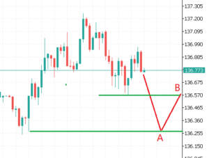 b) Os investidores esperam que o USDJPY rompa o nível de resistência da linha A e, em seguida, recupere e caia novamente quando a linha B for bloqueada, portanto, o tipo de ordem Sell Stop Limit pode ser usado;