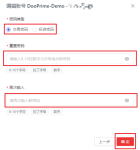 3. 选择您需要重置的密码类型,重置一组 8-15 位数字与字母组合的新密码,再次输入新密码,然后按确定。 重置密码后需要通过电邮或手机进行验证,完成后即可启用新密码。