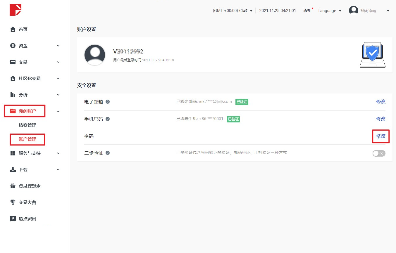 1. 登入D Prime 使用者中心後,在左邊欄位按下「我的帳號」,下選「帳號管理」進入「帳號設定」介面,在「密碼」處按下「修改」。